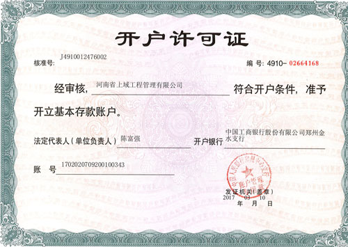 開(kāi)戶(hù)許可證 開(kāi)戶(hù)許可證 河南省上域工程管理有限公司資質(zhì)證書(shū) 上一條: 資質(zhì)證書(shū) 下一條: 營(yíng)業(yè)執(zhí)照